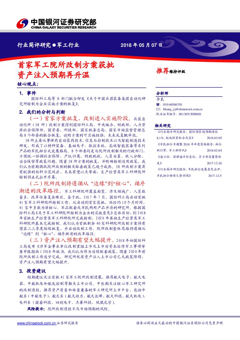 中国银河:军工行业:首家军工院所改制方案获批 资产注入预期再升温.pdf