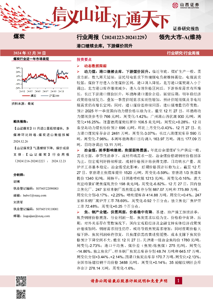 山西证券:煤炭行业周报:港口继续去库,下游煤价回升.pdf