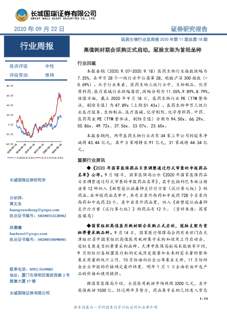 长城国瑞证券:医药生物行业双周报2020年第11期总第18期:高值耗材联合采购正式启动,冠脉支架为首批品种.pdf