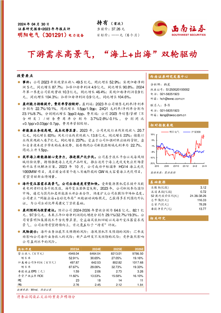 西南证券:明阳电气(301291)-2023年年报点评:下游需求高景气,“海上+出海”双轮驱动.pdf