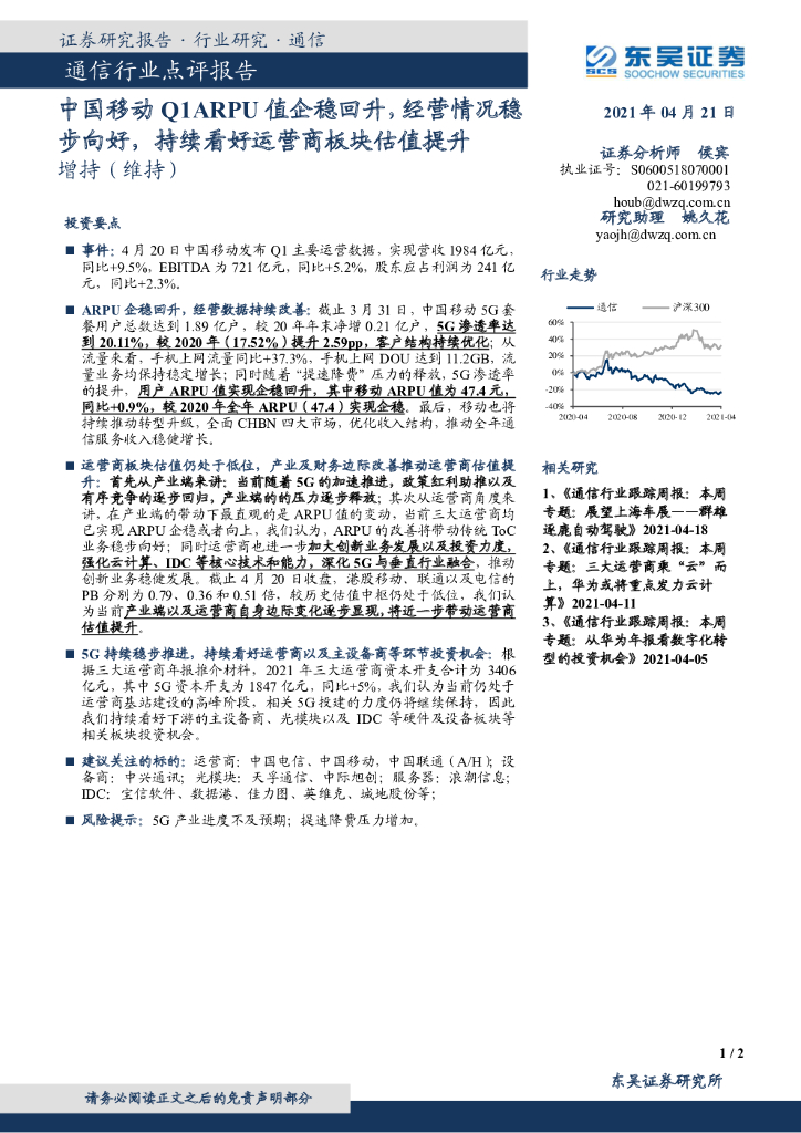 东吴证券:通信行业点评报告:中国移动Q1ARPU值企稳回升,经营情况稳步向好,持续看好运营商板块估值提升.pdf