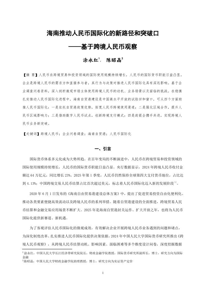 国际货币网:【IMI Working Paper No.2512】海南推动人民币国际化的新路径和突破口——基于跨境人民币观察.pdf