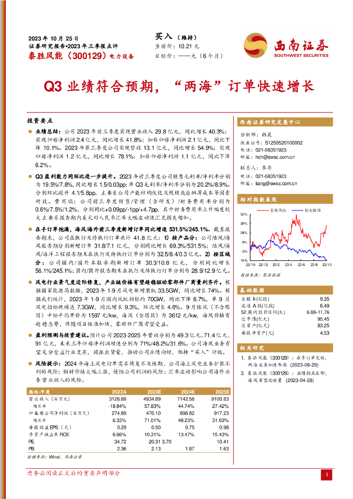 西南证券:泰胜风能(300129)-2023年三季报点评:Q3业绩符合预期,“两海”订单快速增长.pdf