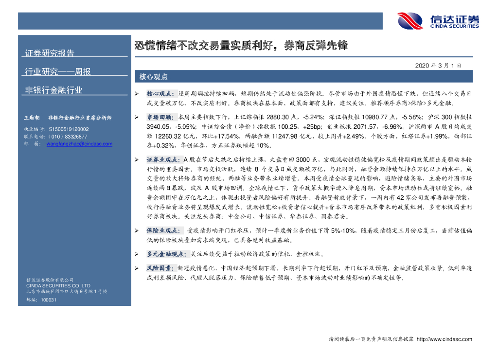 信达证券:非银行金融行业周报:恐慌情绪不改交易量实质利好,券商反弹先锋.pdf