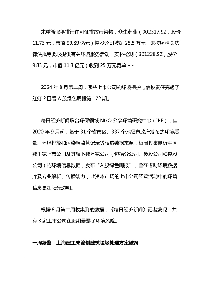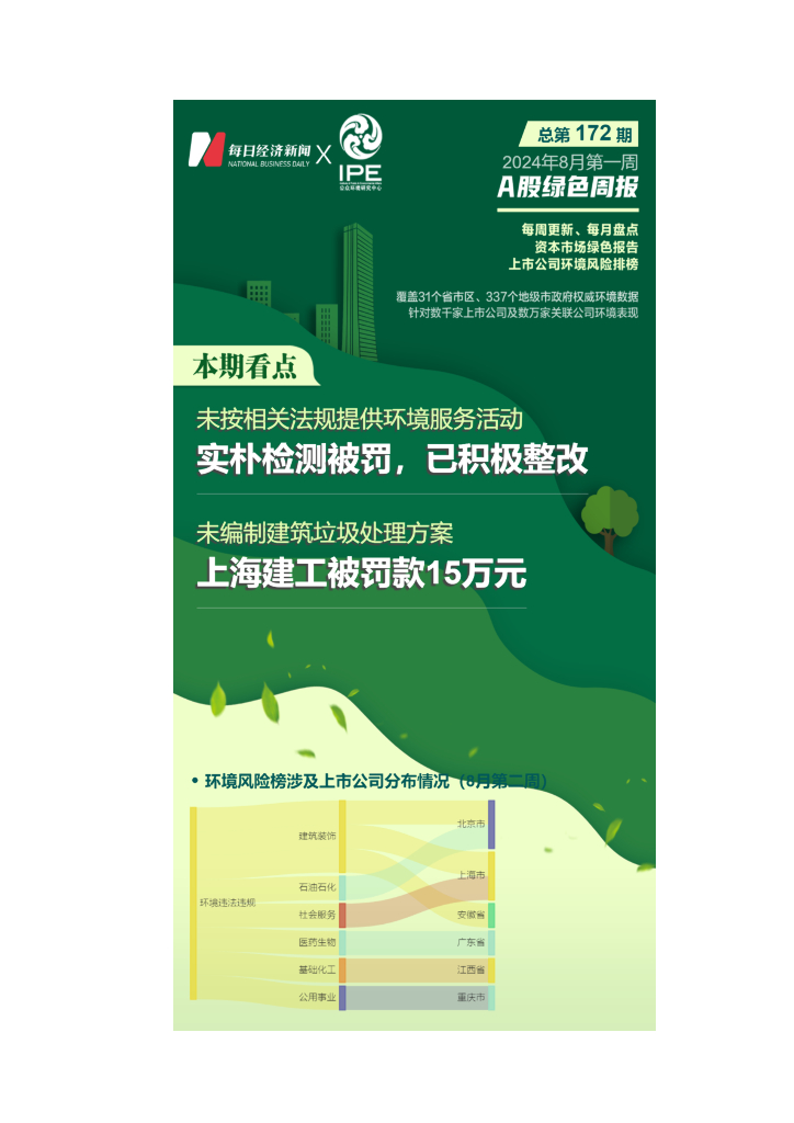 A股绿色周报(2024年8月第一周 总第172期):8家上市公司暴露环境风险 实朴检测被罚并责令停业整顿,公司:已积极整改.pdf
