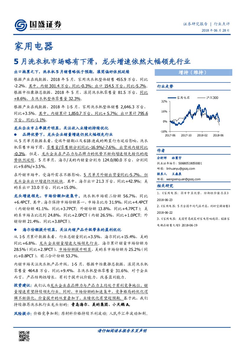 国盛证券:家用电器行业点评:5月洗衣机市场略有下滑,龙头增速依然大幅领先行业.pdf