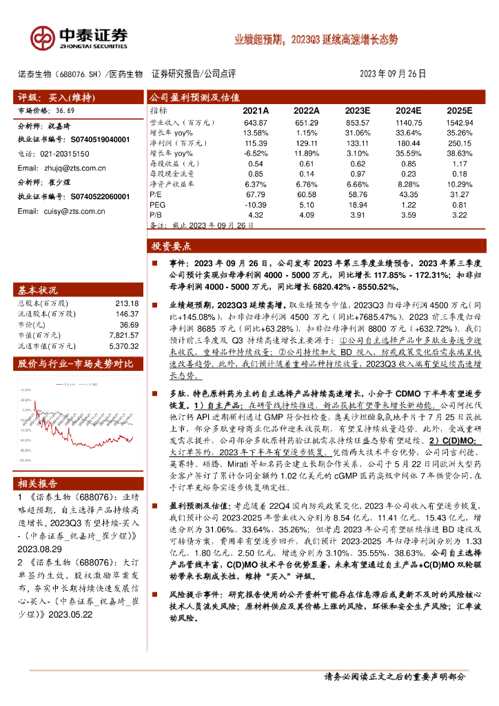 中泰证券:诺泰生物(688076)-业绩超预期,2023Q3延续高速增长态势.pdf