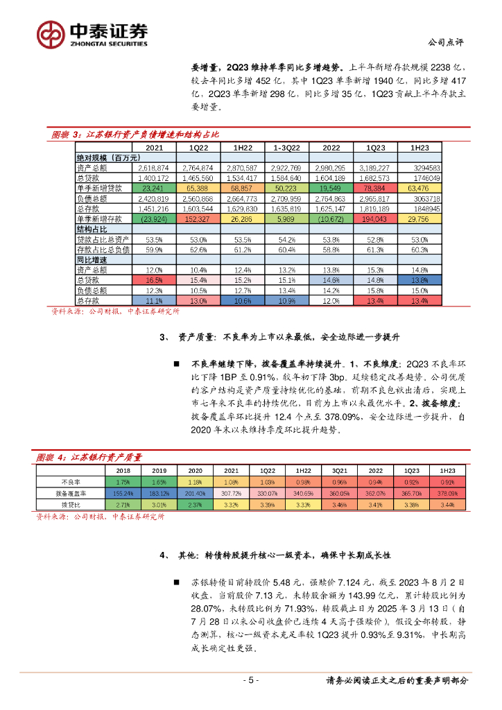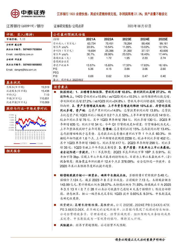 中泰证券:江苏银行1H23业绩快报:高成长逻辑持续兑现,净利润高增27.2%;资产质量不断优化.pdf