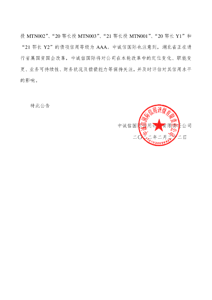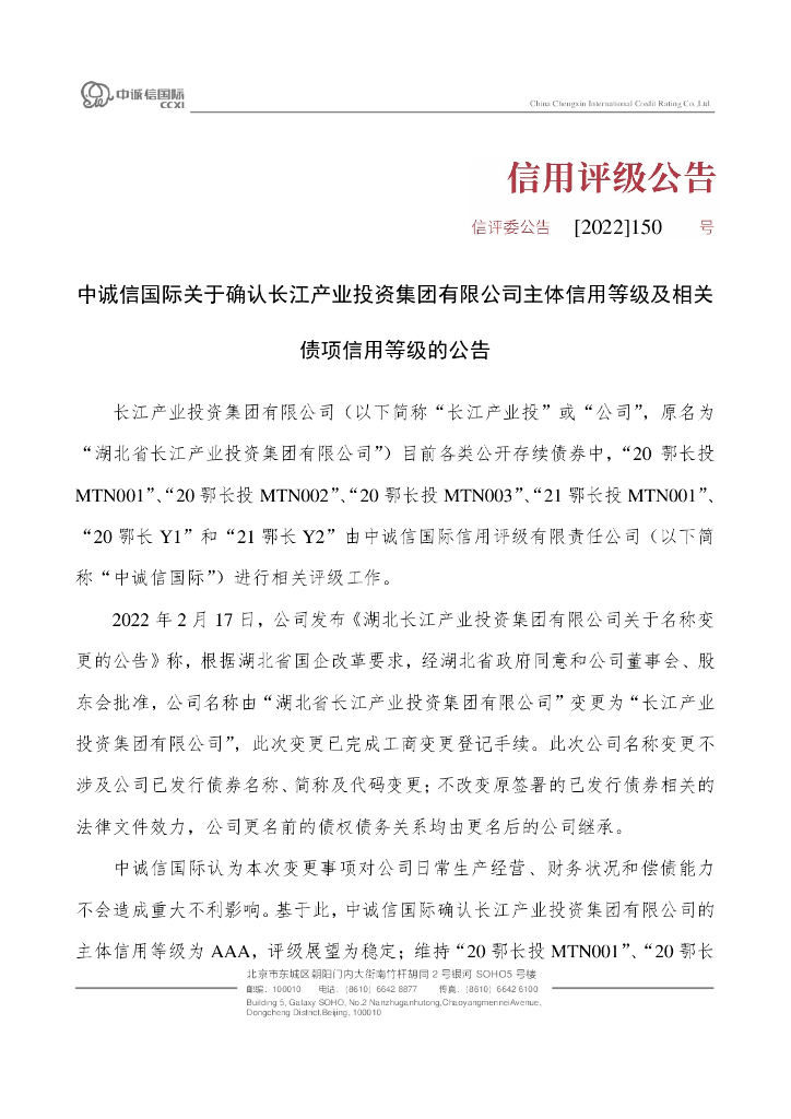 中诚信:中诚信国际关于确认长江产业投资集团有限公司主体信用等级及相关债项信用等级的公告.pdf