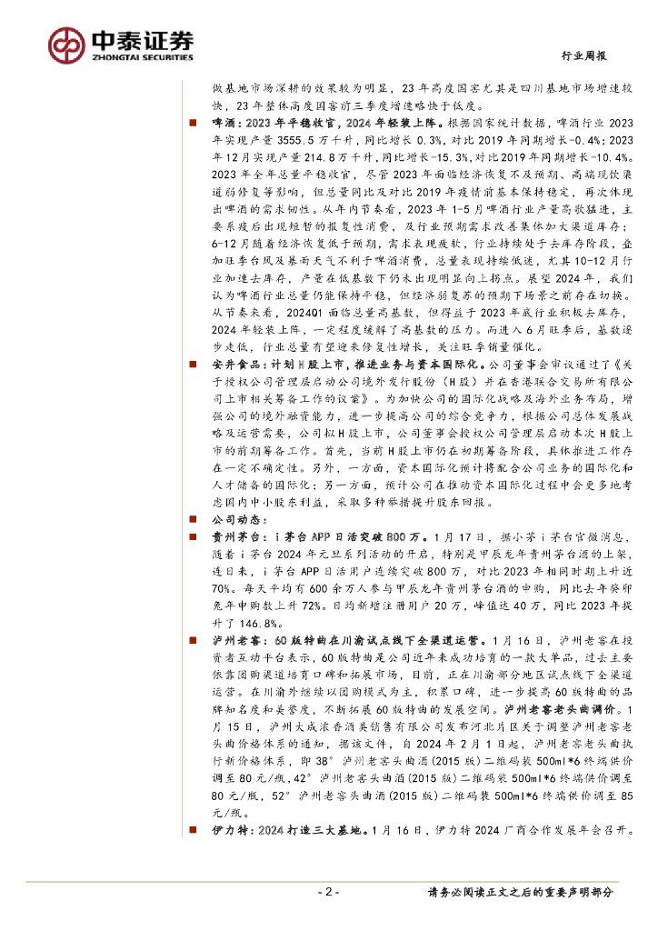 中泰证券:食品饮料周思考(第4周):23年规上白酒产量小幅下降,啤酒24年轻装上阵.pdf