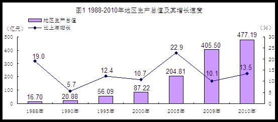 国民经济平稳较快发展。初步核算,2010年全市生产总值(GDP)477.19亿元,比上年增长13.5%,增幅比上年提升3.4个百分点,比全年经济增长预期目标高出2.5个百分点。“十一五”期间GDP年均增长16.7%,比“十一五”规划目标高出0.7个百分点,比“十五”期间年均增速加快了0.1个百分点。分产业看,第一产业增加值61.89亿元,比上年增长6.1%,对经济增长的贡献率为5.7%,拉动GDP增长0.8个百分点;第二产业增加值263.59亿元,增长19.7%,对经济增长的贡献率达77.8%,拉动GDP增长10.5个百分点;第三产业增加值151.71亿元,增长6.5%,对经济增长的贡献率为16.5%,拉动GDP增长2.2个百分点。其中现代服务业增加值88.11亿元,占第三产业增加值的比重达58.1%。三次产业结构的比例由上年的13.1:52.0:34.9调整为13.0:55.2:31.8。