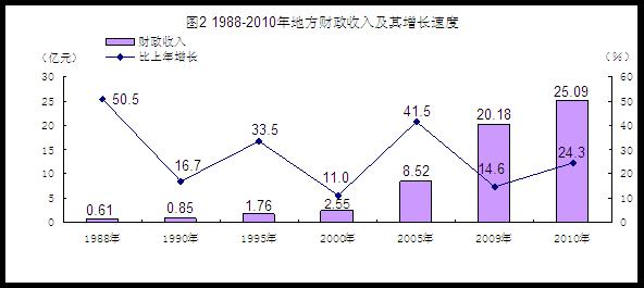 财政收支较快增长。全年完成地方财政一般预算收入25.09亿元,比上年增长24.3%,比“十五”期末增加了16.57亿元,增长了近两倍,五年年均增长24.1%,比计划目标高出4.1个百分点;其中税收收入20.36亿元,比上年增长27.2%,五年年均增长24.5%。地方财政一般预算支出90.85亿元,增支14.9%。各项重点支出得到有效保障。其中,用于教育、科学技术、社会保障和就业、医疗卫生、环境保护、农林水事务等重点支出分别比上年增长17.0%、25.1%、16.4%、21.8%、48.4%和16.9 %。