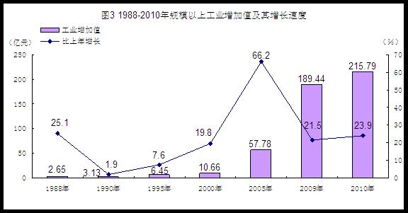 工业生产较快增长。全年全部工业增加值232.50亿元,比上年增长23.0%,其中规模以上工业增加值215.79亿元,增长23.9%,“十一五”期间年均增长31.5%。在规模以上工业中,国有及国有控股企业增加值21.62亿元,比上年增长27.7%;股份制企业增加值98.44亿元,增长19.7%;外商及港澳台商投资企业增加值88.04亿元,增长32.1%;民营企业增加值101.34亿元,增长21.2%。分轻重工业看,轻工业增加值56.78亿元,增长13.1%;重工业增加值159.01亿元,增长28.9%。