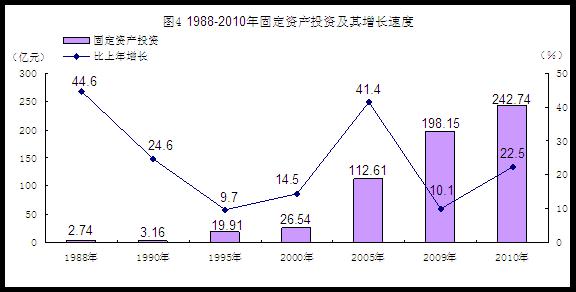 固定资产投资较快增长。全年全社会固定资产投资242.74亿元,比上年增长22.5%,“十一五”期间年均增长15.9%。分三次产业看,第一产业投资6.72亿元,比上年下降19.4%;第二产业投资72.59亿元,增长15.8%;第三产业投资163.42亿元,增长28.6%,其中交通运输、仓储和邮政业投资24.07亿元,增长55.9%,电力、燃气及水的生产和供应业投资18.95亿元,下降37.1%,水利、环境和公共设施管理投资26.12亿元,增长45.5%,城市建设投资15.85亿元,增长21.7%。分投资主体看,国有经济投资63.58亿元,增长19.7%;民间投资146.18亿元,增长30.9%;港澳台、外商经济投资32.98亿元,下降1.3%。分城乡看,城镇投资161.83亿元,增长24.9%;农村投资80.90亿元,增长17.9%。