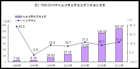消费品市场活跃。2010年全市社会消费品零售总额163.07亿元,比上年增长17.2%,“十一五”期间年均增长17.4%。分地域看,城镇消费品零售额131.28亿元,比上年增长18.5%;农村消费品零售额31.79亿元,增长12.3%。分行业看,批发和零售业零售额150.61亿元,增长17.3%;住宿和餐饮业零售额12.46亿元,增长16.1%。分商品类别看,家用电器和音像器材类、汽车类商品销售凸显亮点,实现零售额分别为3.02亿元和3.20亿元,分别增长1.07倍和12.3%。