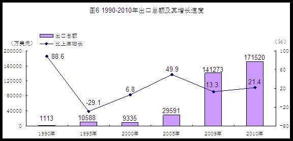 进出口总额快速增长。全年进出口总额27.16亿美元,比上年增长22.1%,“十一五”期间年均增长38.8%。其中出口总额17.15亿美元,比上年增长21.4%,“十一五”期间年均增长42.1%。“三资企业”是出口主力军,实现出口额14.04亿美元,比上年增长24.3%,占全市出口总额的比重达81.9%;民营企业出口1.4亿美元,比上年增长32.9%。在出口总值中,河源对香港、美国、欧盟、日本的出口额13.34亿美元,占全市出口总额的比重达77.8%。