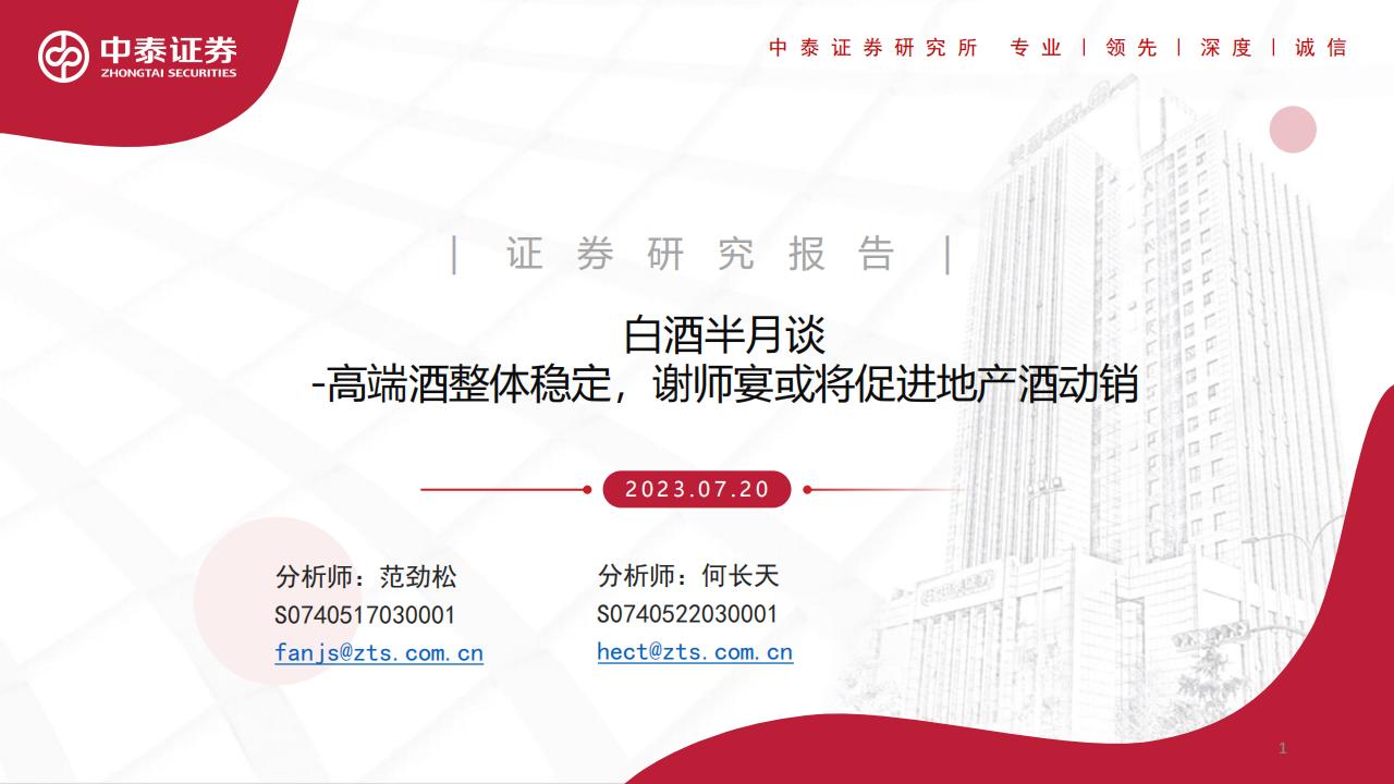 中泰证券:白酒半月谈:高端酒整体稳定,谢师宴或将促进地产酒动销.pdf