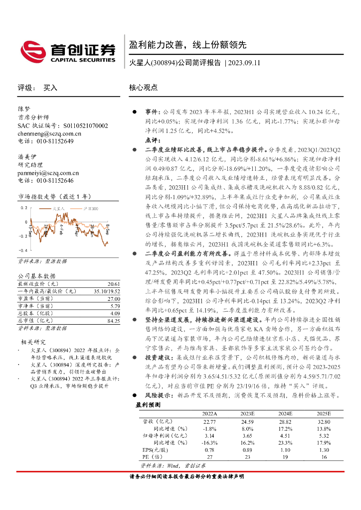 首创证券:火星人(300894)-公司简评报告:盈利能力改善,线上份额领先.pdf