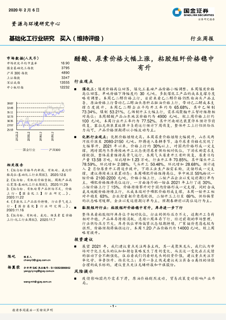 国金证券:基础化工行业研究:醋酸、尿素价格大幅上涨,粘胶短纤价格稳中有升.pdf