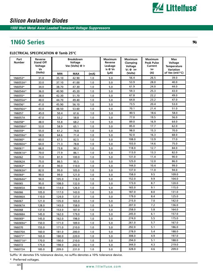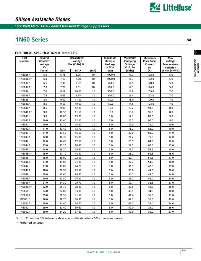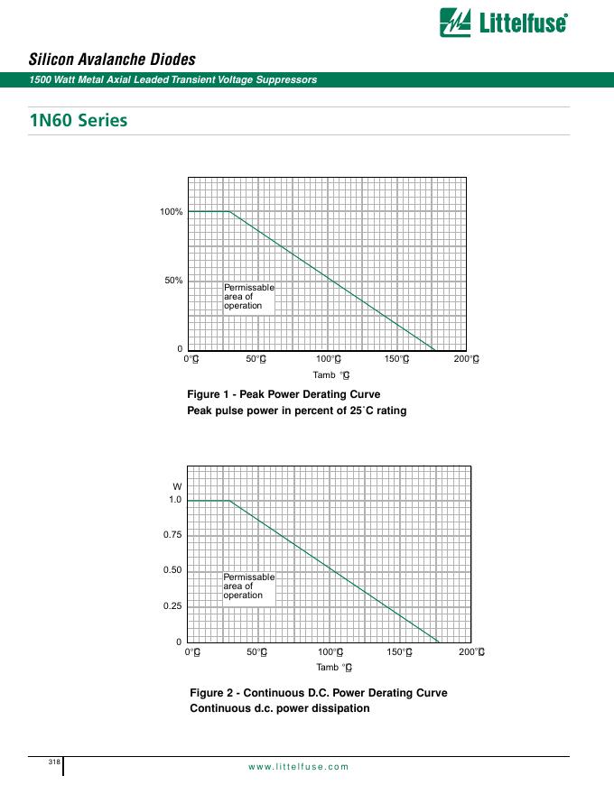 Littelfuse Silicon Avalanche Diodes 1500 Watt Metal Axial Leaded Transient Voltage Suppressors 1N60 Series 数据手册.pdf