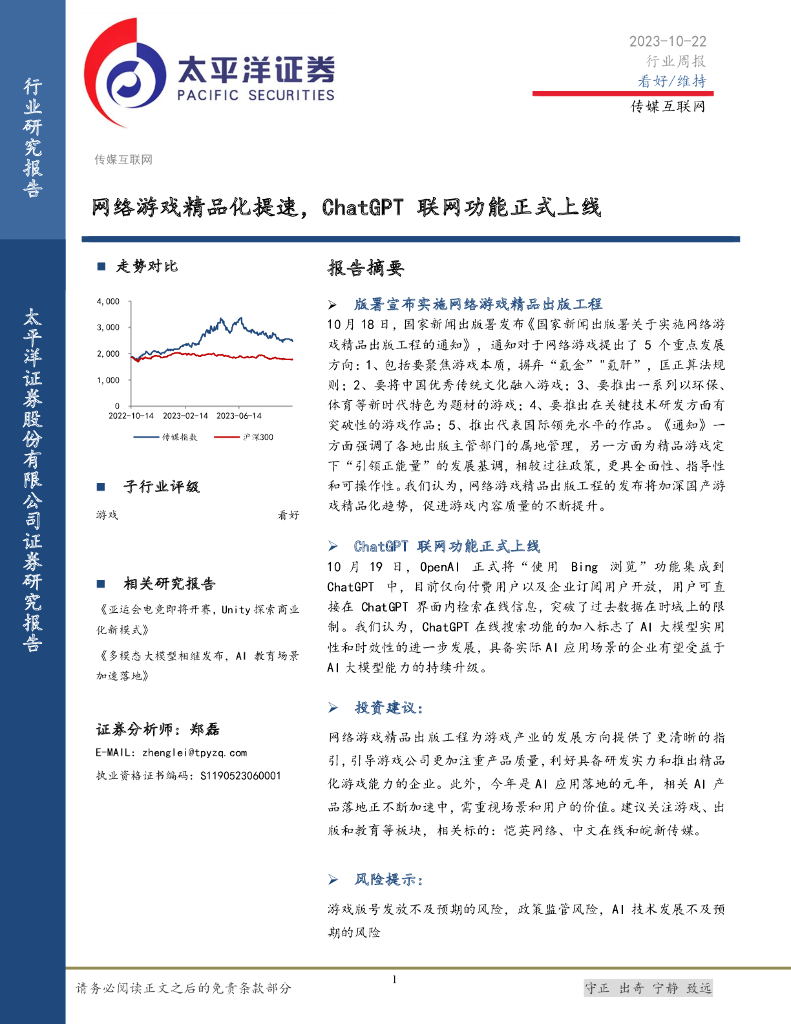 太平洋证券:传媒互联网行业周报:网络游戏精品化提速,ChatGPT联网功能正式上线.pdf