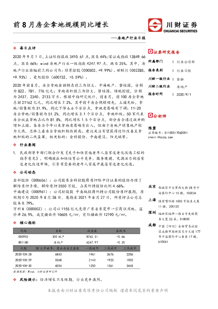 川财证券:房地产行业日报:前8月房企拿地规模同比增长.pdf