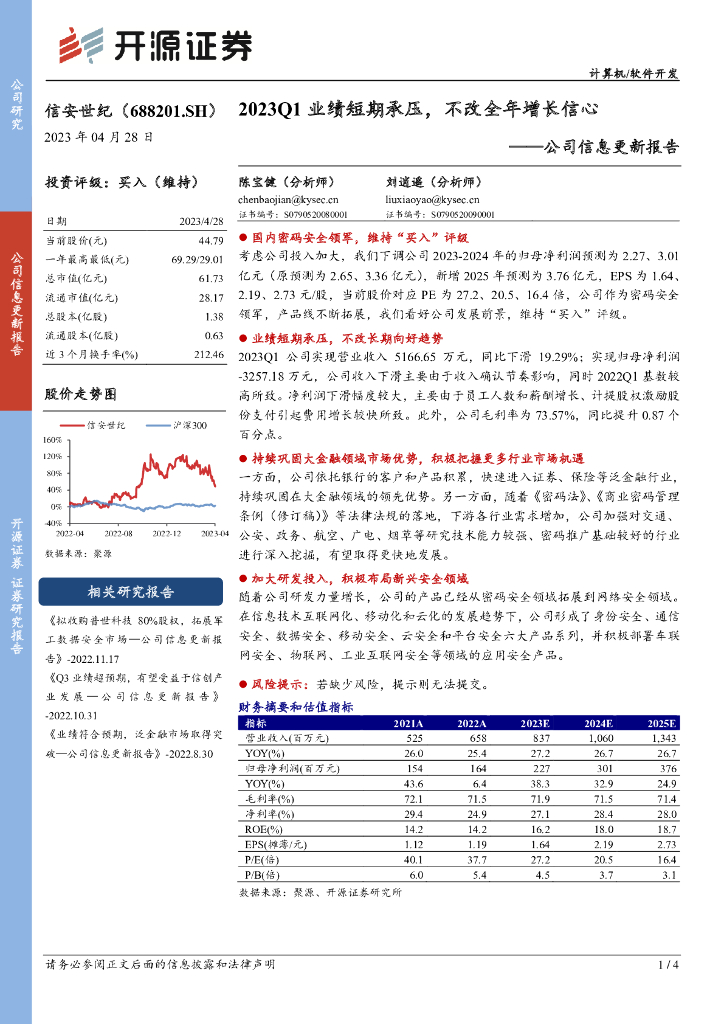 开源证券:信安世纪(688201)-公司信息更新报告:2023Q1业绩短期承压,不改全年增长信心.pdf