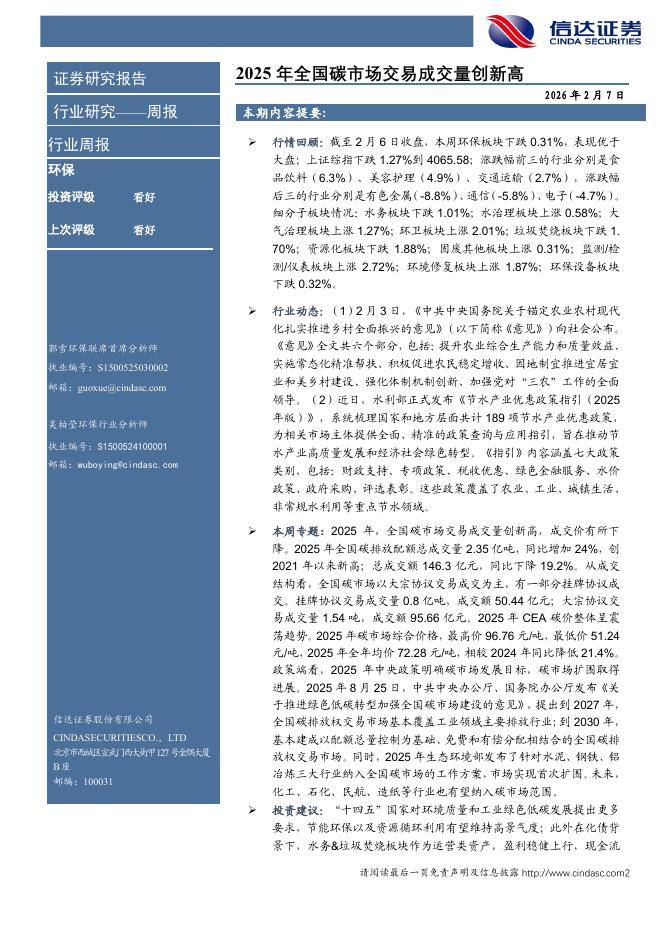信达证券:环保行业周报:2025年全国碳市场交易成交量创新高.pdf