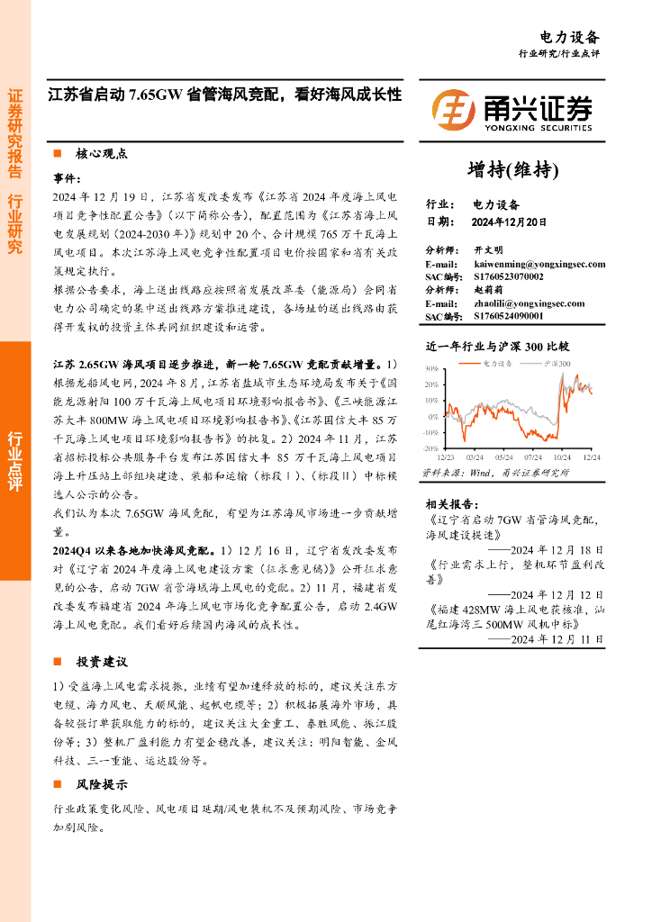 甬兴证券:电力设备:江苏省启动7.65GW省管海风竞配,看好海风成长性.pdf