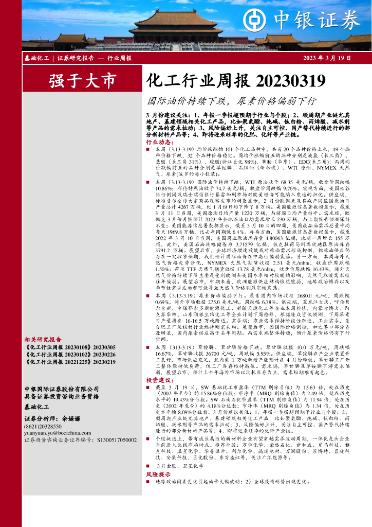中银证券:化工行业周报:国际油价持续下跌, 尿素价格偏弱下行.pdf
