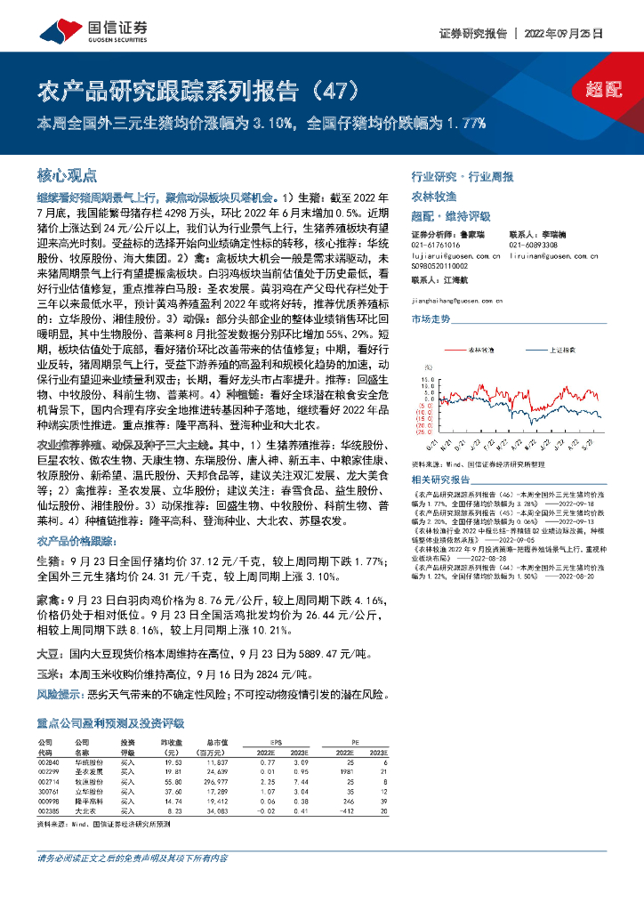 国信证券:农产品研究跟踪系列报告(47):本周全国外三元生猪均价涨幅为3.10%,全国仔猪均价跌幅为1.77%.pdf