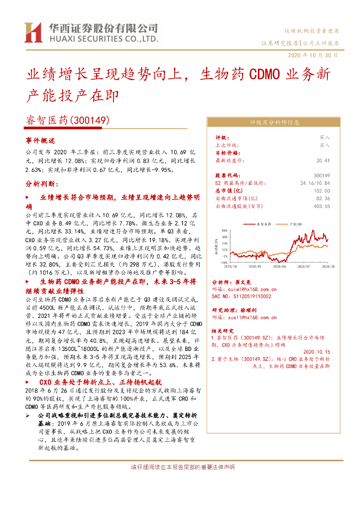华西证券:睿智医药(300149)-业绩增长呈现趋势向上,生物药CDMO业务新产能投产在即.pdf