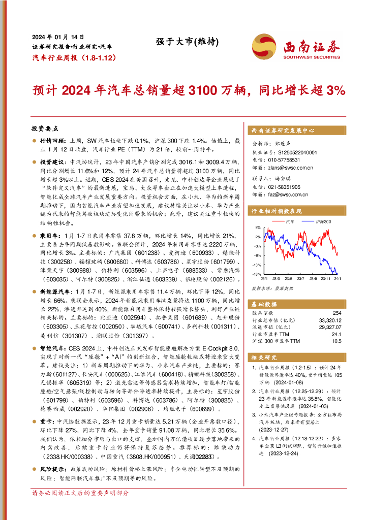 西南证券:汽车行业周报:预计2024年汽车总销量超3100万辆,同比增长超3%.pdf
