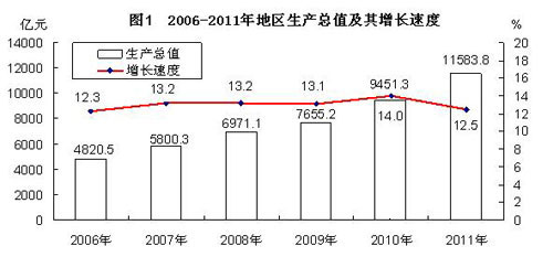 初步核算,全年实现地区生产总值11583.8亿元,比上年增长12.5%。其中,第一产业增加值1391.1亿元,增长4.2%;第二产业增加值6592.2亿元,增长15.5%;第三产业增加值3600.5亿元,增长10.7%。三次产业对经济增长的贡献率分别为4.3%、67.4%和28.3%。三次产业结构调整为12.0:56.9:31.1。非公有制经济快速发展,实现增加值6393.2亿元,增长13.6%,占GDP的比重达55.2%。鄱阳湖生态经济区主体地位初步显现,实现生产总值6804.8亿元,增长12.8%,占全省的58.7%。十大战略性新兴产业完成增加值1568.3亿元,增长21.6%。人均生产总值25884元,增长11.8%。