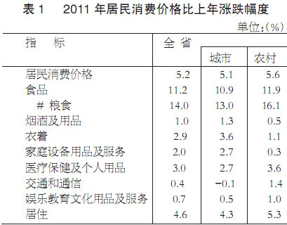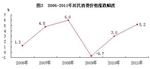 全年居民消费价格上涨5.2%,其中食品价格上涨11.2%,拉动居民消费价格上涨3.6个百分点;居住类价格上涨4.6%。商品零售价格上涨4.8%。工业生产者出厂价格上涨11.3%,其中冶金工业上涨23.4%。工业生产者购进价格上涨12.4%,其中有色金属材料和电线类上涨25.1%。固定资产投资价格上涨8.4%。农产品生产价格上涨14.3%。