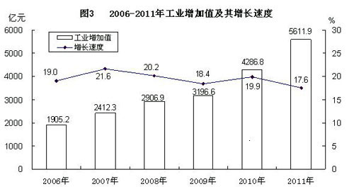 全年全部工业完成增加值5611.9亿元,比上年增长17.6%,占生产总值比重达48.4%,比上年提高3.0个百分点。其中,规模以上工业增加值3910.9亿元,增长19.1%。在规模以上工业中,轻工业增加值1241.7亿元,增长20.2%;重工业增加值2669.2亿元,增长18.6%。分企业类型看,国有企业增加值382.0亿元,增长10.2%;集体企业增加值24.3亿元,增长4.3%;股份合作企业增加值42.7亿元,增长18.9%;股份制企业增加值1277.6亿元,增长17.2%;私营企业增加值1439.9亿元,增长22.4%;外商港澳台投资企业增加值741.4亿元,增长21.9%。