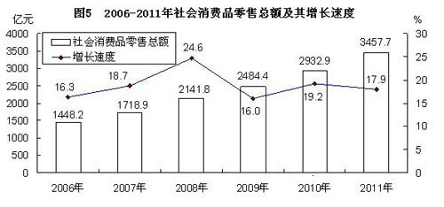 全年社会消费品零售总额3457.7亿元,比上年增长17.9%。分城乡看,城镇消费品零售额2859.4亿元,增长18.0%;乡村消费品零售额598.3亿元,增长17.4%。限额以上批发零售业零售额1021.8亿元,增长35.3%。其中,汽车类零售额241.0亿元,增长25.9%;家具类零售额11.6亿元,增长52.1%;金银珠宝类零售额14.9亿元,增长49.1%;建筑及装潢材料类零售额10.5亿元,增长59.5%。