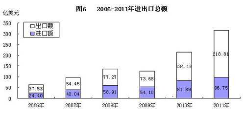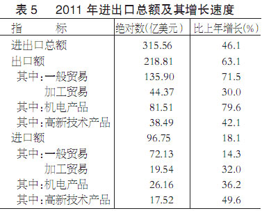 全年进出口总额315.56亿美元,比上年增长46.1%。其中,出口218.81亿美元,增长63.1%;进口96.75亿美元,增长18.1%。在出口中,外商投资企业出口额59.73亿美元,增长19.6%;私营及其他企业出口额143.52亿美元,增长1.0倍;国有企业出口额15.56亿美元,增长11.4%。