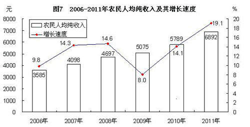 全年农民人均纯收入6892元,比上年增长19.1%;城镇居民人均可支配收入17495元,增长13.0%。农村居民恩格尔系数45.2%,城镇居民恩格尔系数39.8%。年末农村居民人均住房使用面积46.8平方米,城镇居民人均住房建筑面积39.4平方米,比上年末分别增加6.6平方米和0.5平方米。