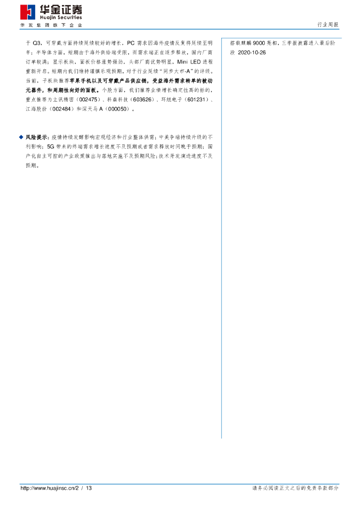 华金证券:电子元器件2020年第47周:华为出售荣耀定音,MiniLED进程打开重启节奏.pdf