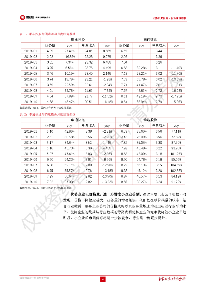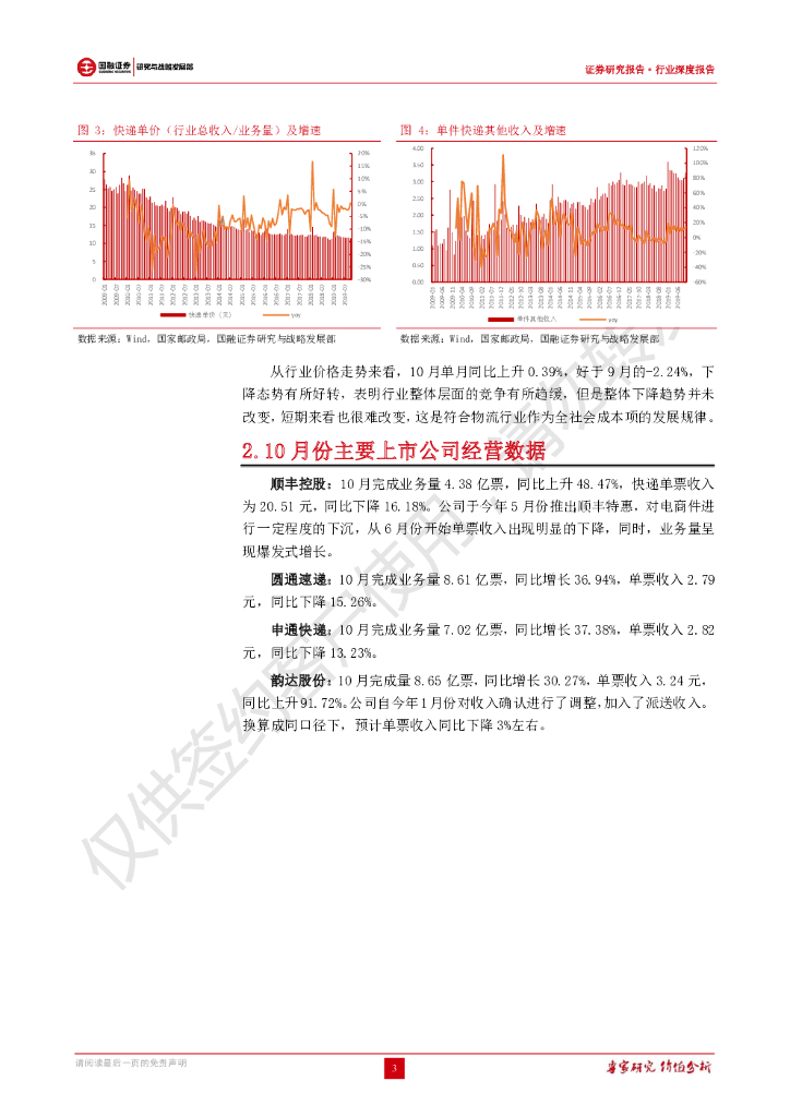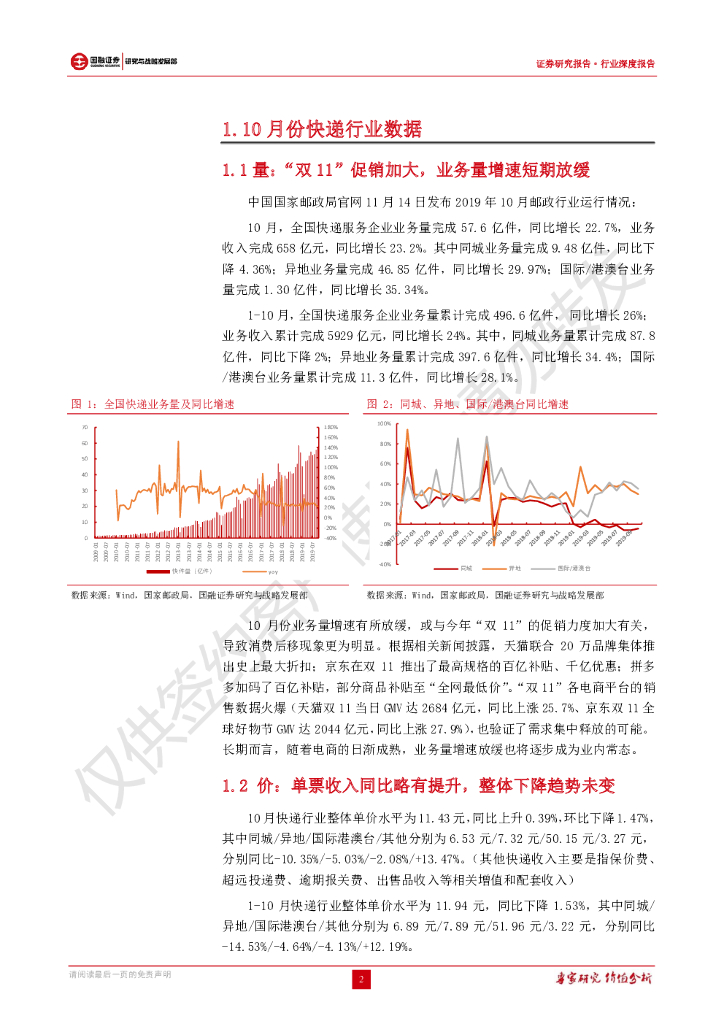 国融证券:2019年快递行业10月份数据点评:业务量增速短期放缓,单价同比稍有回升.pdf