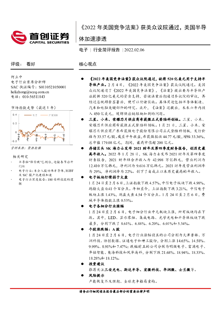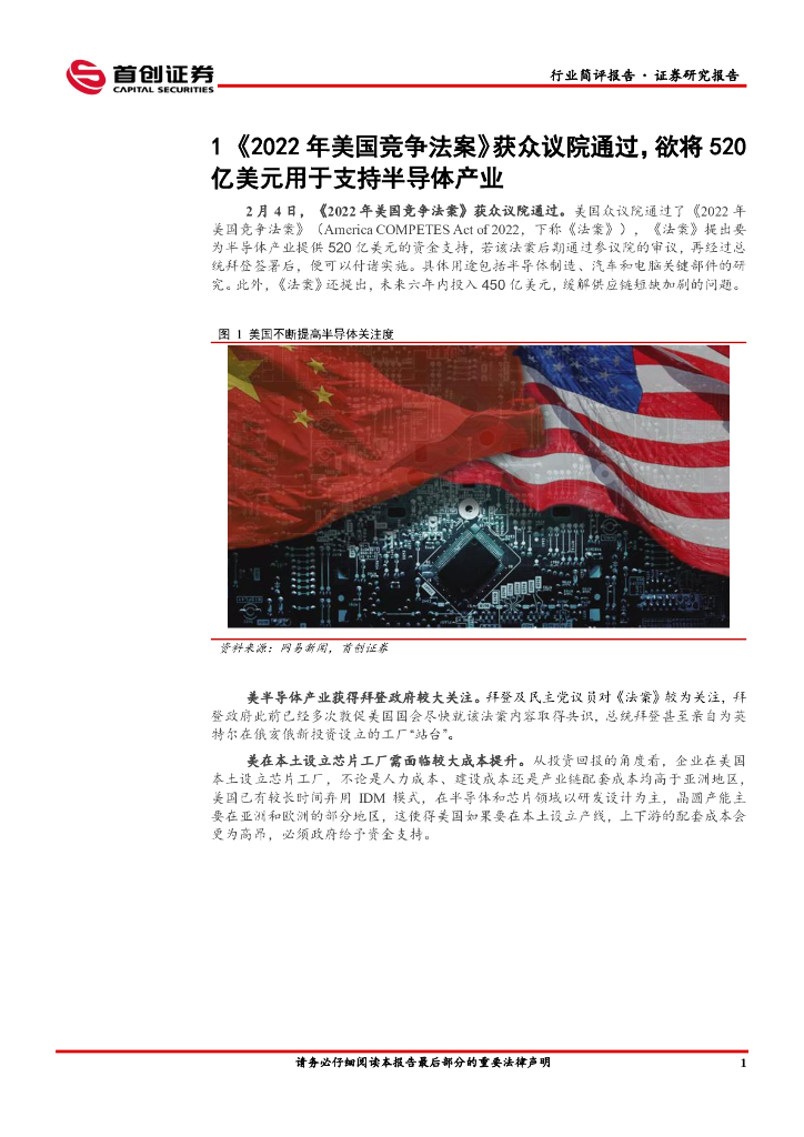 首创证券:电子行业简评报告:《2022年美国竞争法案》获美众议院通过,美国半导体加速渗透.pdf