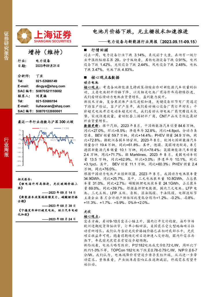 上海证券:电力设备与新能源行业周报:电池片价格下跌,无主栅技术加速推进.pdf