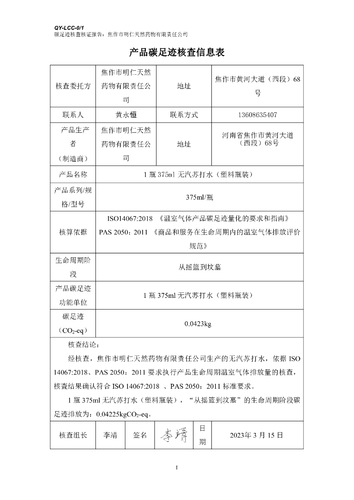 焦作市明仁天然药物有限责任公司无汽苏打水(塑料瓶装)碳足迹核查报告(2022年度).pdf