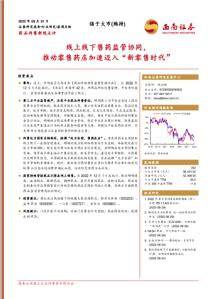 西南证券:医药生物:药品网售新规点评:线上线下售药监管协同,推动零售药店加速迈入“新零售时代”.pdf