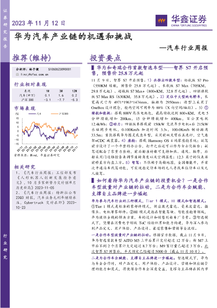 华鑫证券:汽车行业周报:华为汽车产业链的机遇和挑战.pdf
