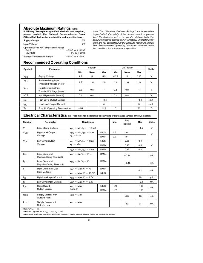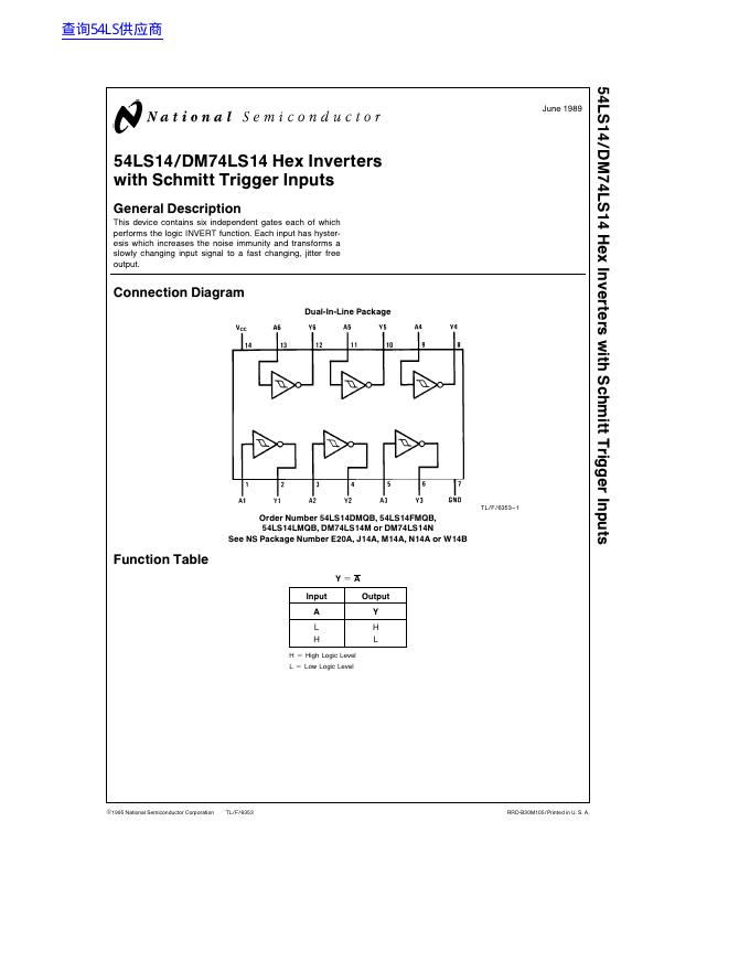 National semiconductor 54LS14/DM74LS14 Hex Inverters with Schmitt Trigger Inputs 数据手册.pdf