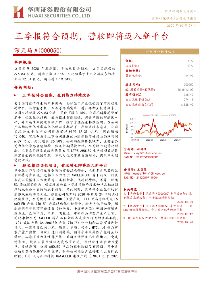华西证券:深天马A(000050)-三季报符合预期,营收即将迈入新平台.pdf