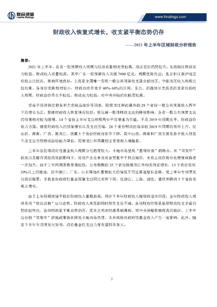 联合资信:财政收入恢复式增长,收支紧平衡态势仍存--2021年上半年区域财政分析报告.pdf
