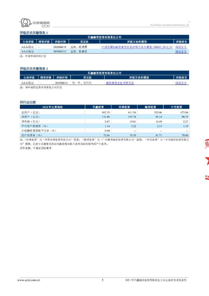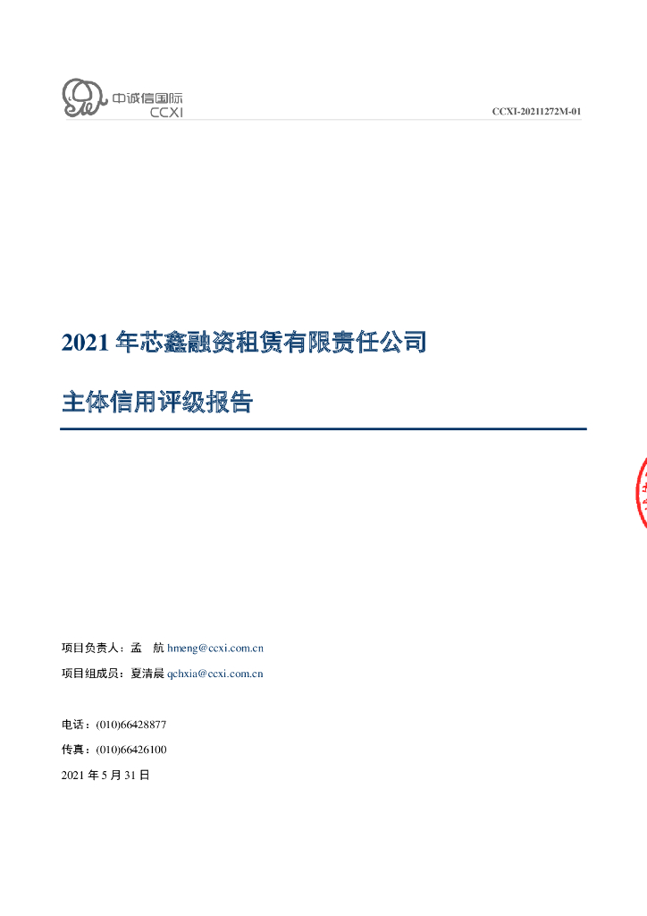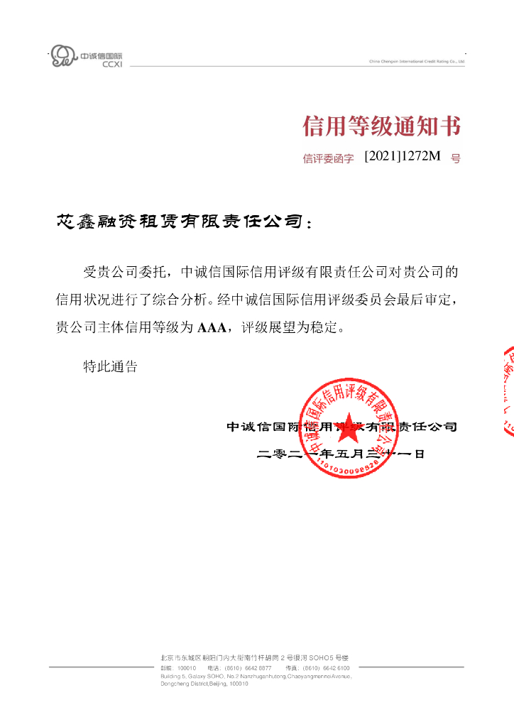 中诚信:芯鑫融资租赁有限责任公司主体信用评级报告及跟踪评级安排.pdf